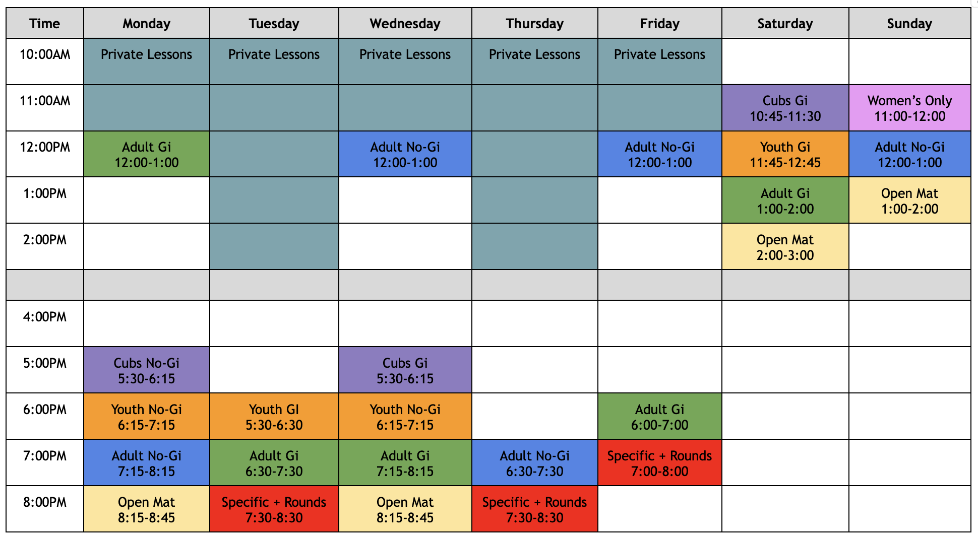 Authentic Jiu Jitsu's schedule offers programming seven days a week and includes: